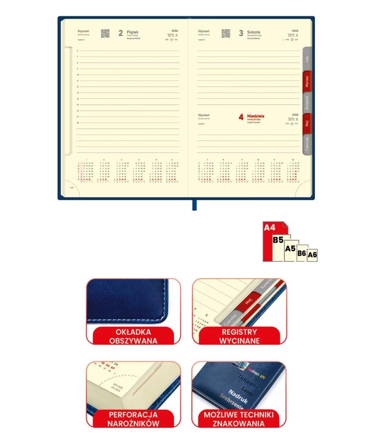 | Dodatkowe informacje | wycięte registry 2 rzędowe, perforacja narożników, zaokrąglone rogi, okładka z łączonej ekoskóry termoprzebarwialnej, obszyta, rok – tłoczony |